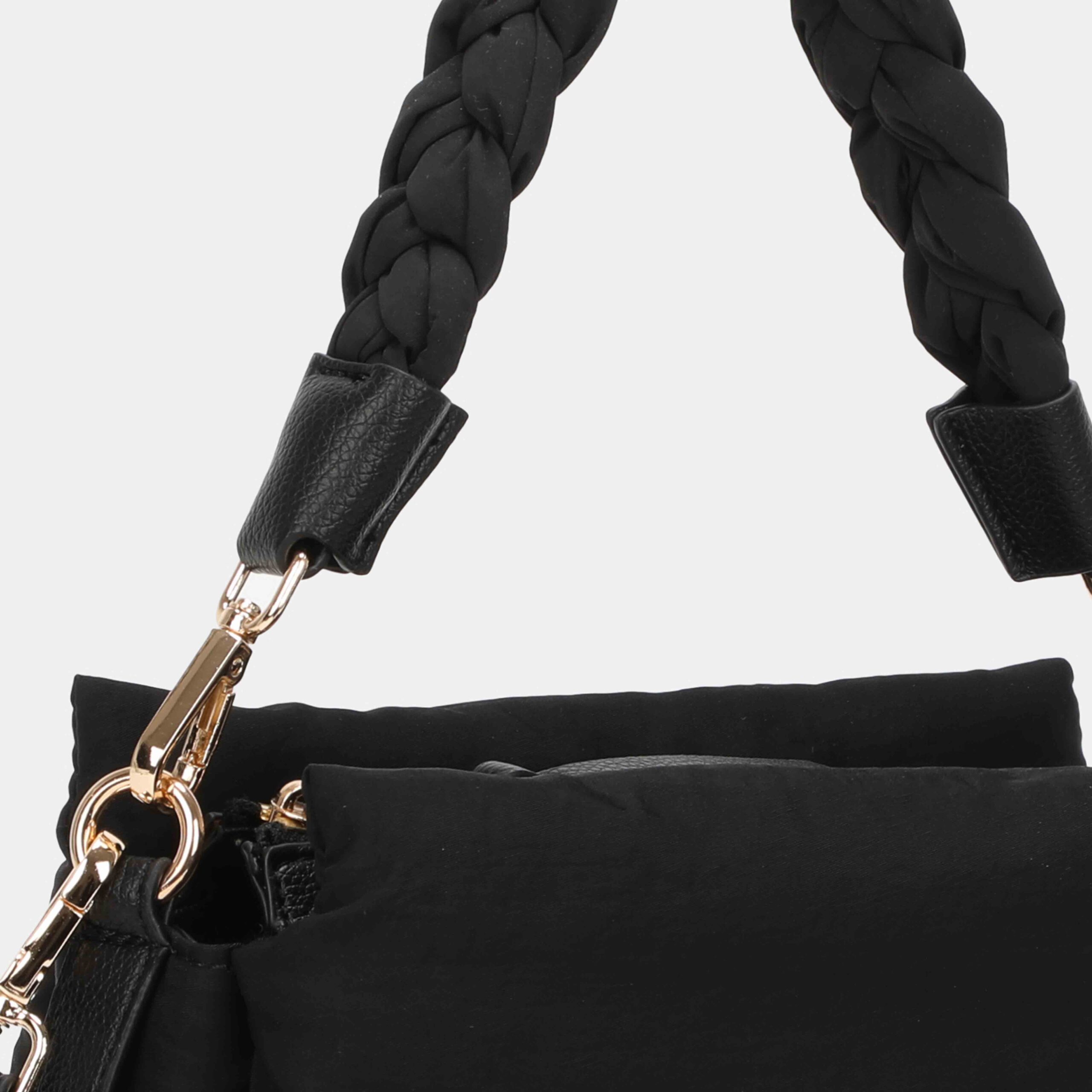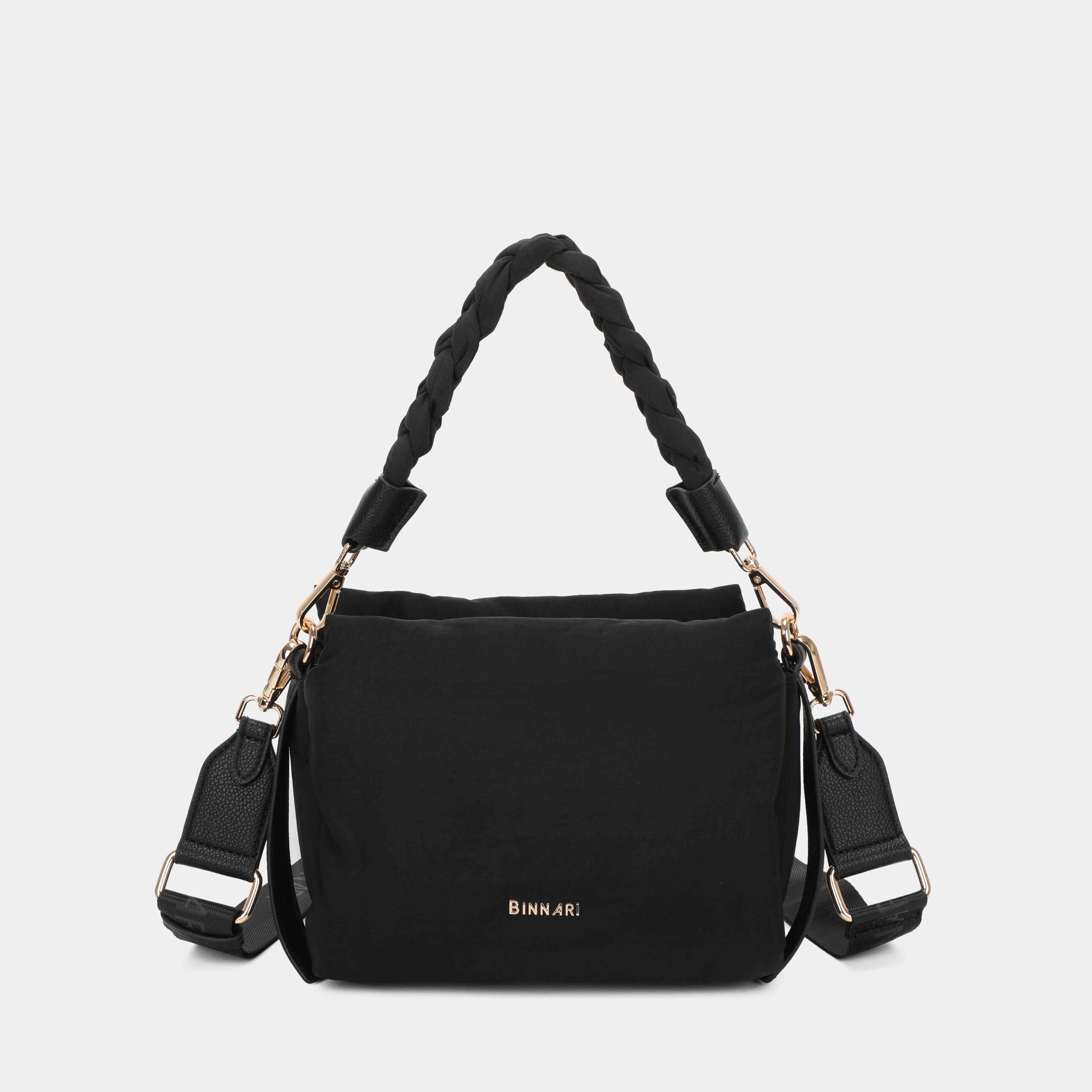 Bolso bandolera de la marca Binnari, color negro, confeccionada en nylon y detalles en pu de alta calidad .