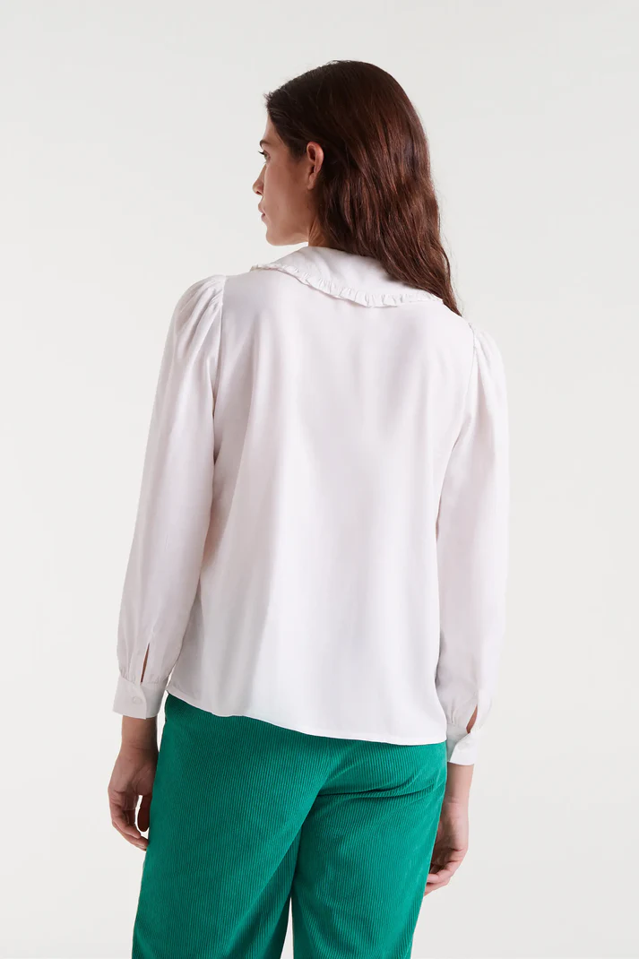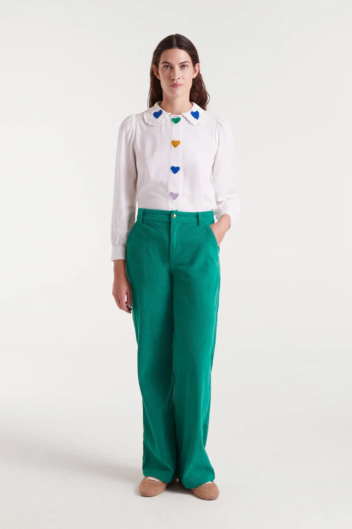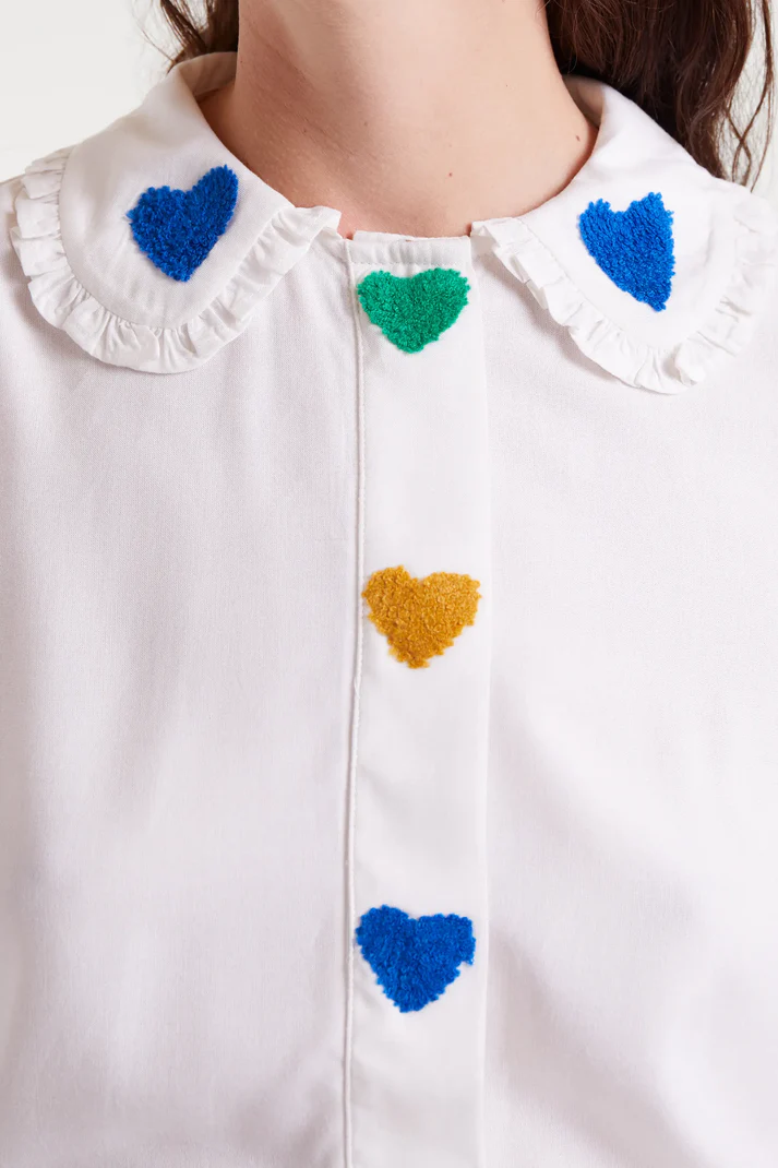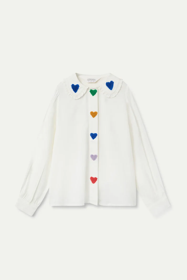 Camisa de la marca Compañía Fantástica, de color blanco, tiene cuello solapa con detalle bordado de corazones y volantes, de manga larga terminada en puño con botón, cierre frontal con botones oculto y detalles de corazones.