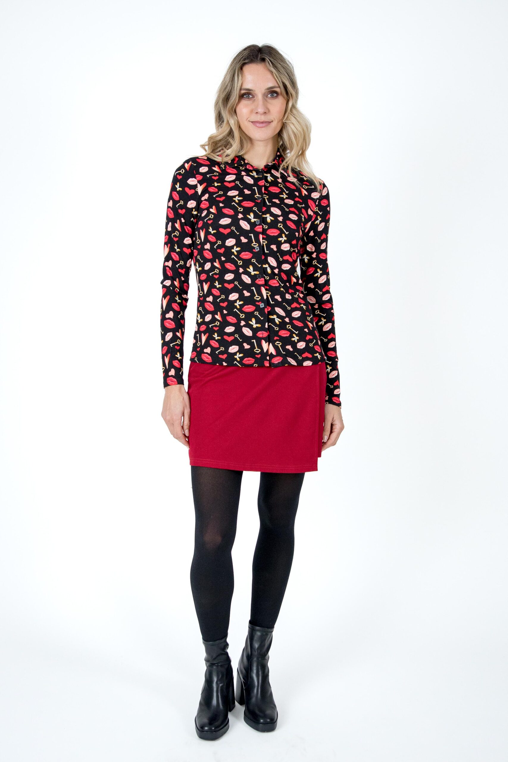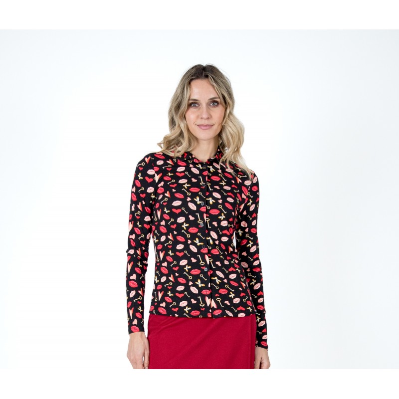 Camisa de la marca Lylu  color negro con estampado de corazones, llaves y labios en tonos rojo. El tejido es elástico y sienta genial. Da poca talla.