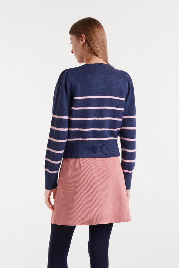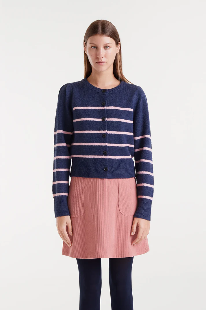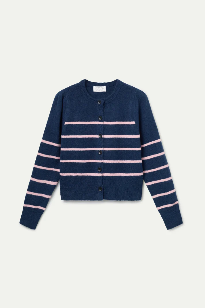 Cárdigan punto de la marca Compañía Fantástica a rayas marineras de color navy blue y rosa. Con cuello redondo y manga larga. Cierre frontal con botones. Detalles con acabados en rib. La modelo mide 177 cm y lleva talla S.