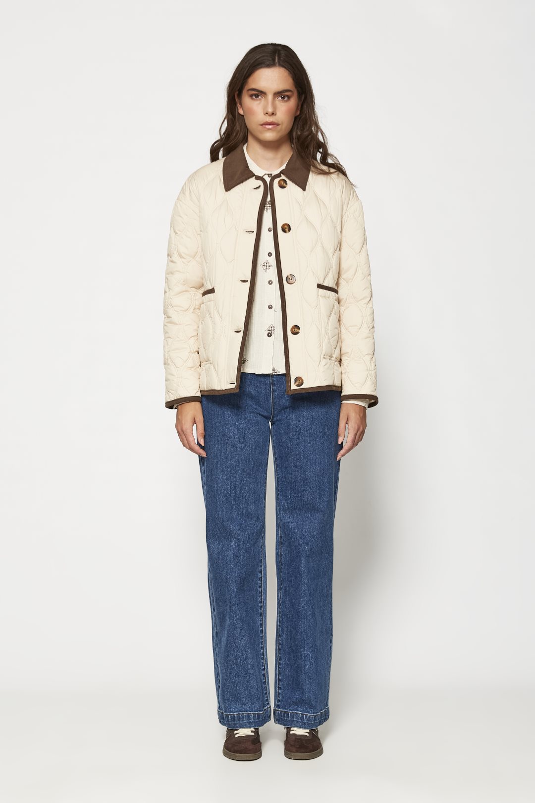Chaqueta acolchada tipo parka de la marca MdM de corte recto con patrón de rombos, cuello de pana en color marrón, cierre con botones y bolsillos de parche con ribete. La parte de atrás es ligeramente mas larga. Confeccionada en tejido técnico con acolchado ligero. Color crudo.