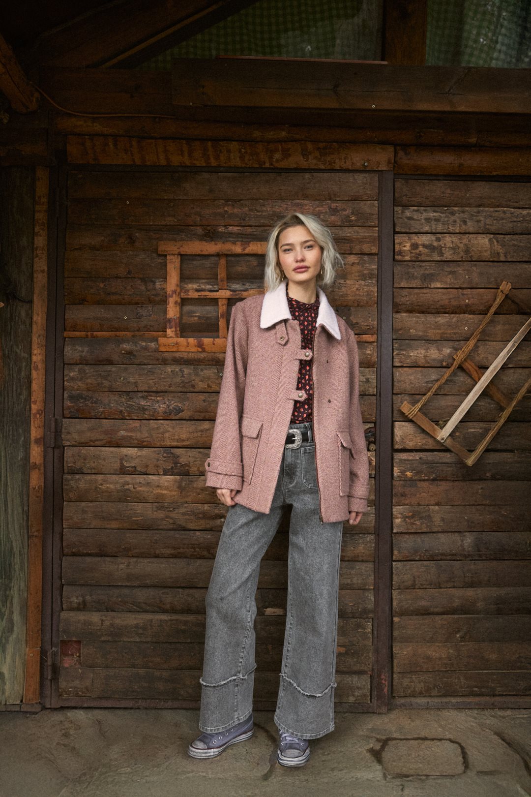 Chaqueta corta de la marca MdM, de corte recto en tejido de espiga con cuello de borreguito, cierre tipo trenca y bolsillos de parche con solapa.