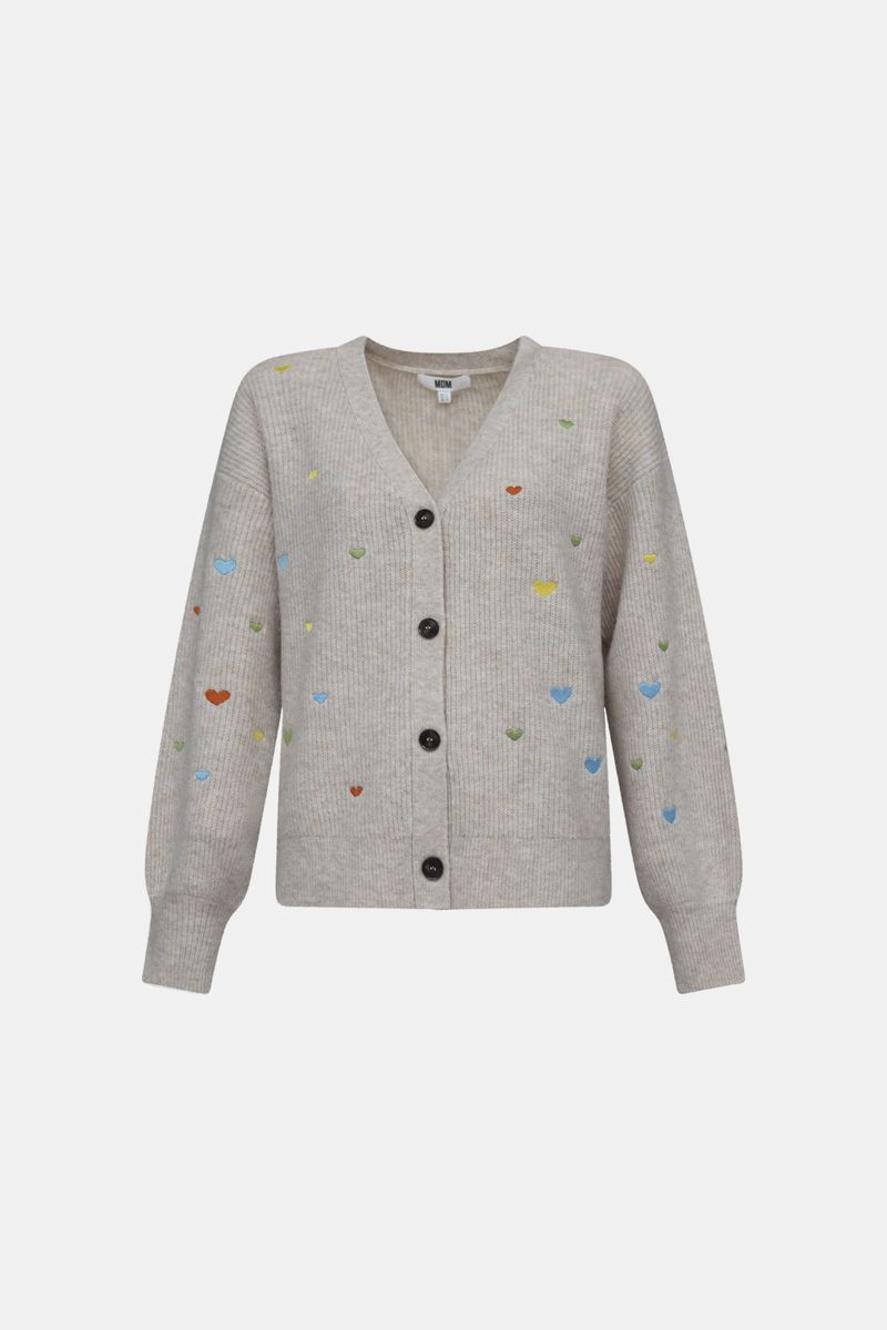 Tiene escote en pico, cierre con botones delanteros y bordado de corazones.