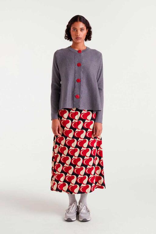 Cárdigan de punto con corte evasé de color gris. Con cuello redondo y manga larga. Cierre frontal con botones a contraste color granate. Detalles en rib. La modelo mide 175 cm y lleva la talla S.
