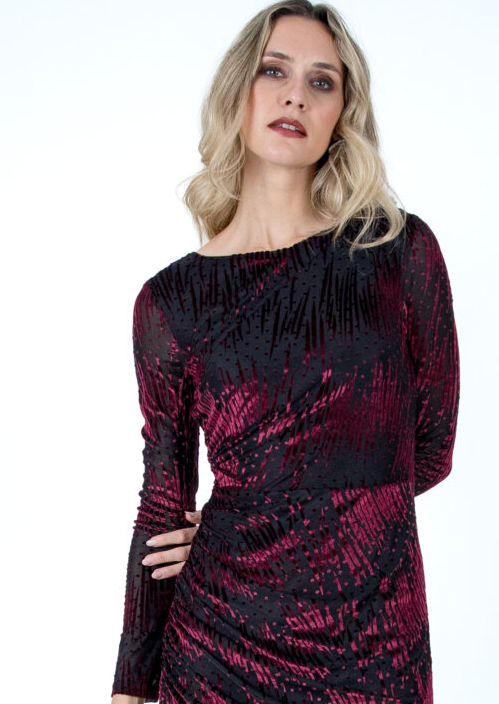 Comprar yaVestido corto de la marca Lylu, corte en la cintura, es ajustado, tejido de tercioepelo, color negro y granates.