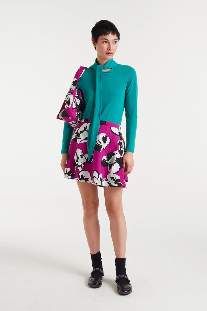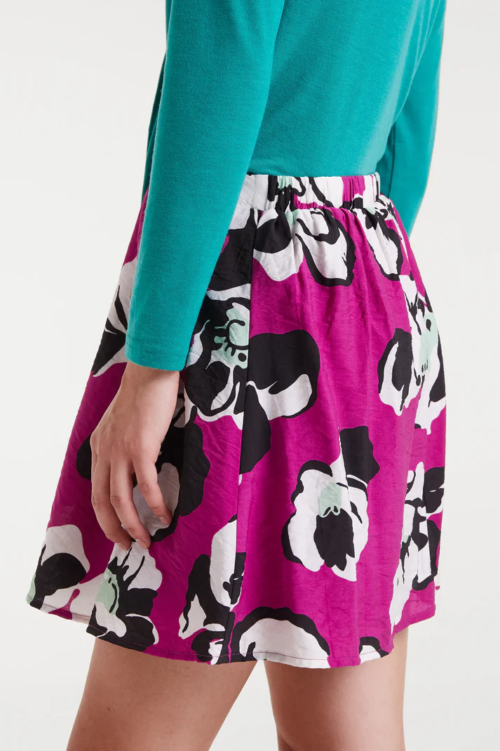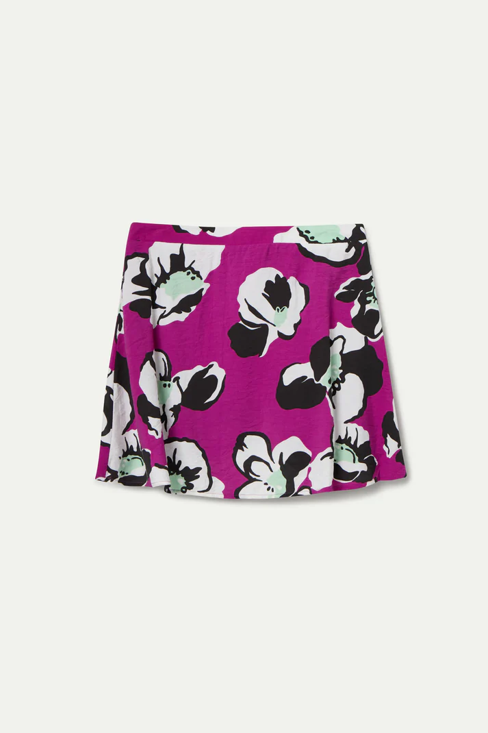 Falda corta de la marca Compañía Fantástica, de tejido crepé ligero con estampado Vivid Viola. Tiro fijo alto. Cierre con cremallera invisible lateral. Forro interior. La modelo mide 177 cm y lleva la talla S.