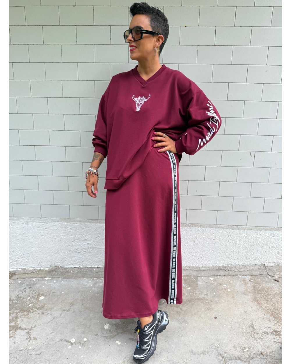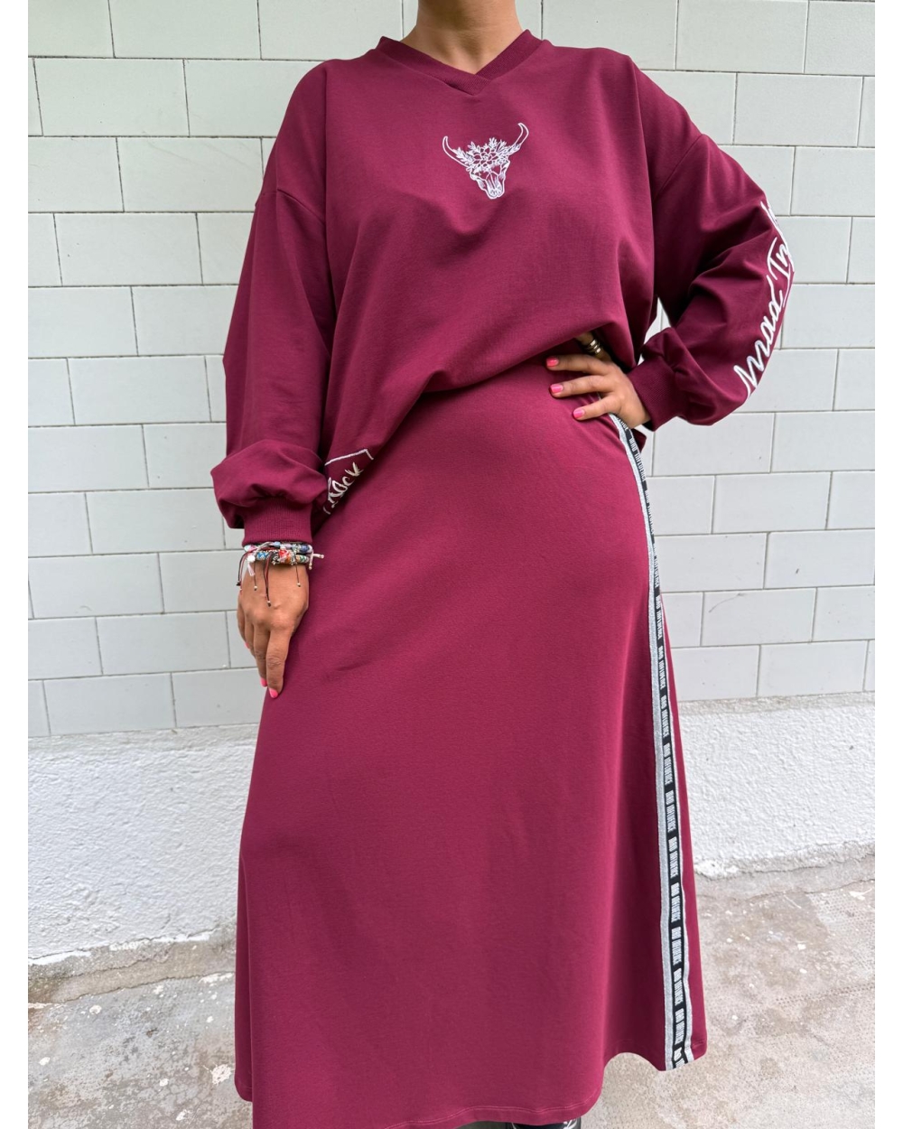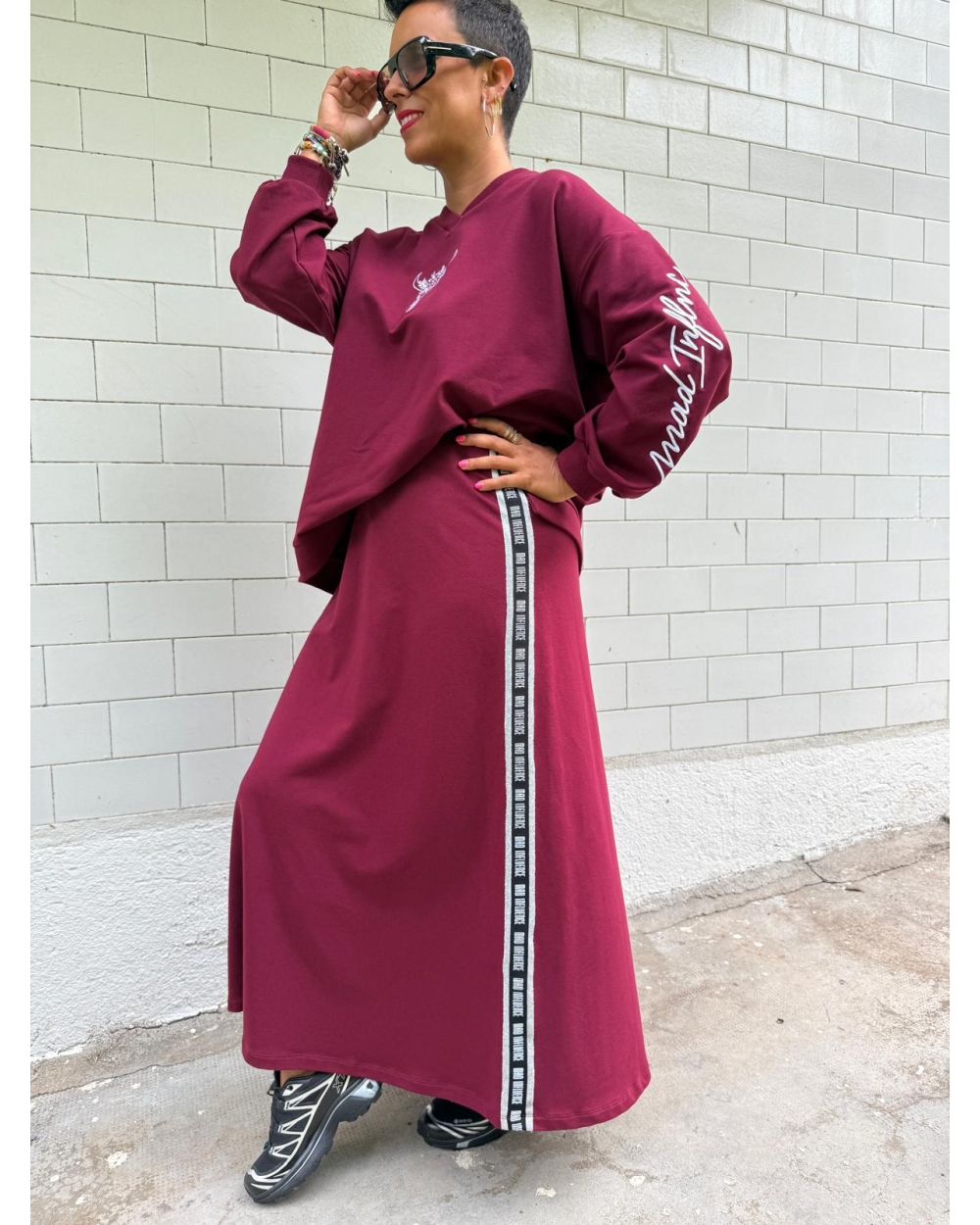 Falda de la marca Mad Influence, color granate en algodón y elástico (tejido sudadera), goma en la cintura, corte evasé y detalle cinta Mad influence en laterales.