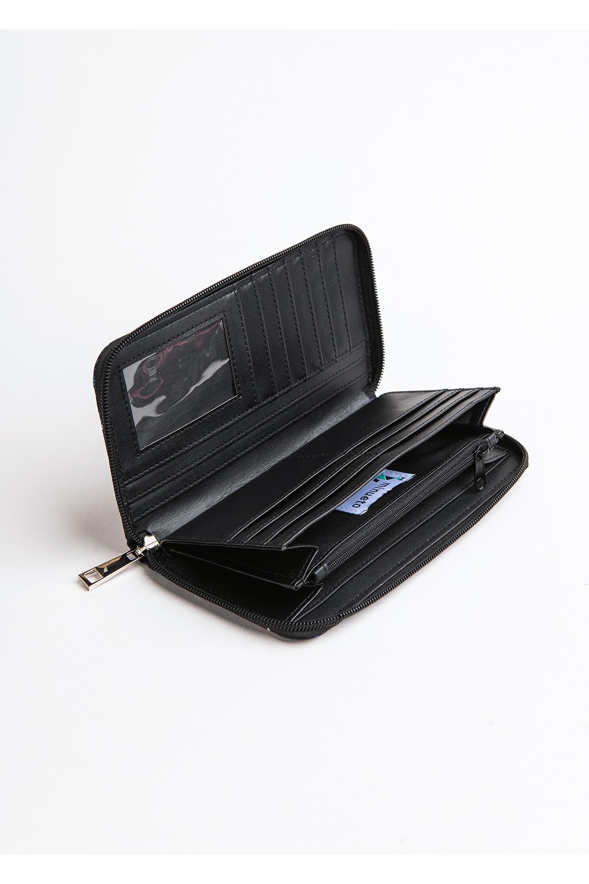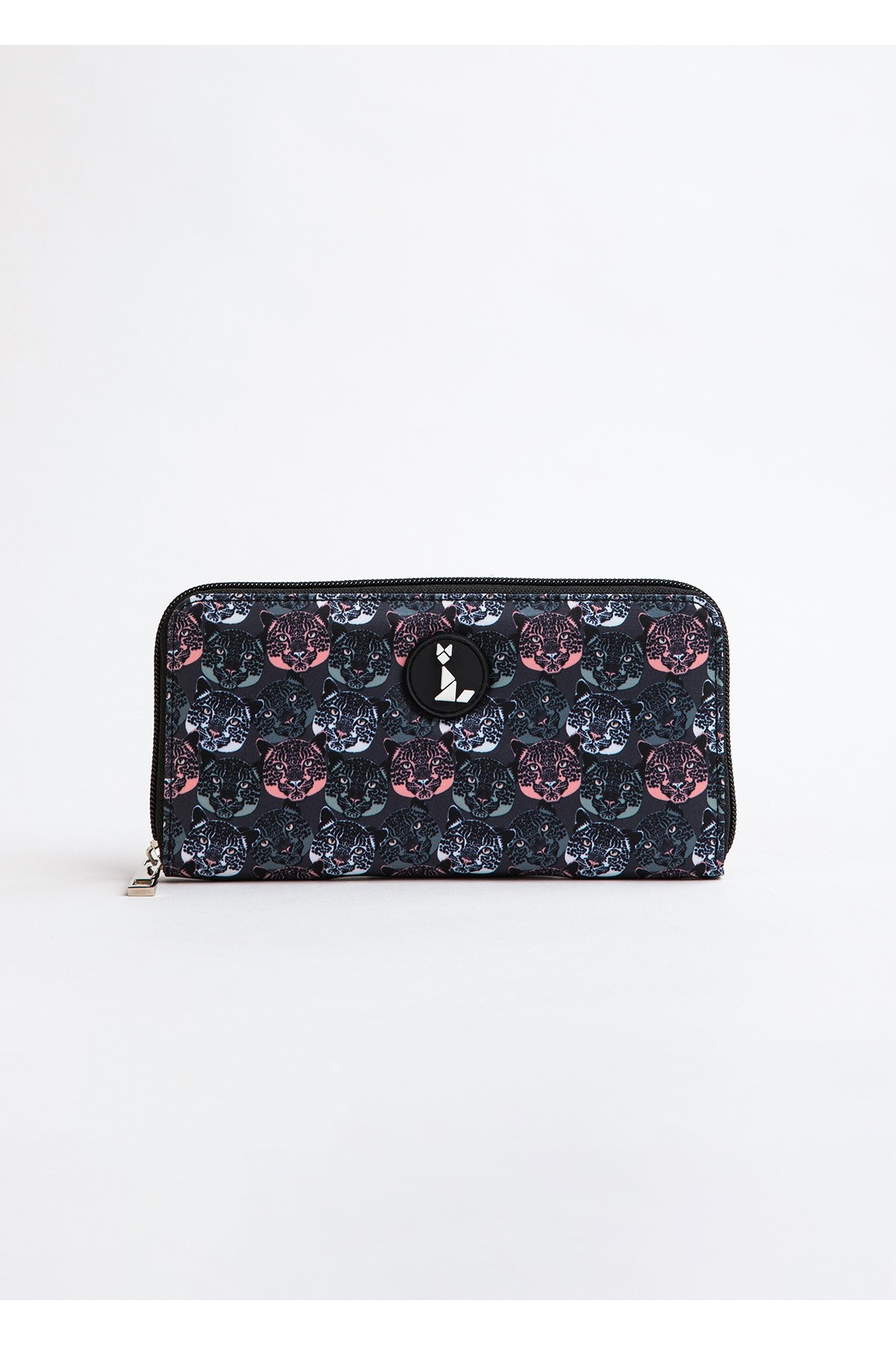 Billetera de la marca Minueto, con estampado animal print, cierre de cremallera y exterior personalizado con logo.