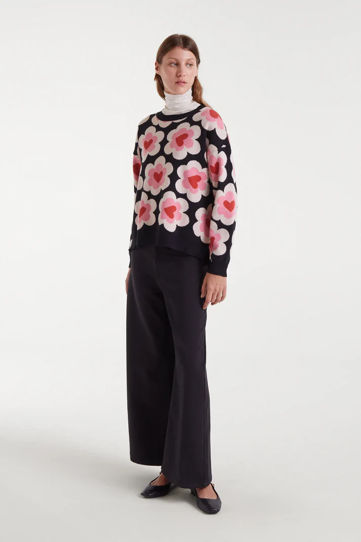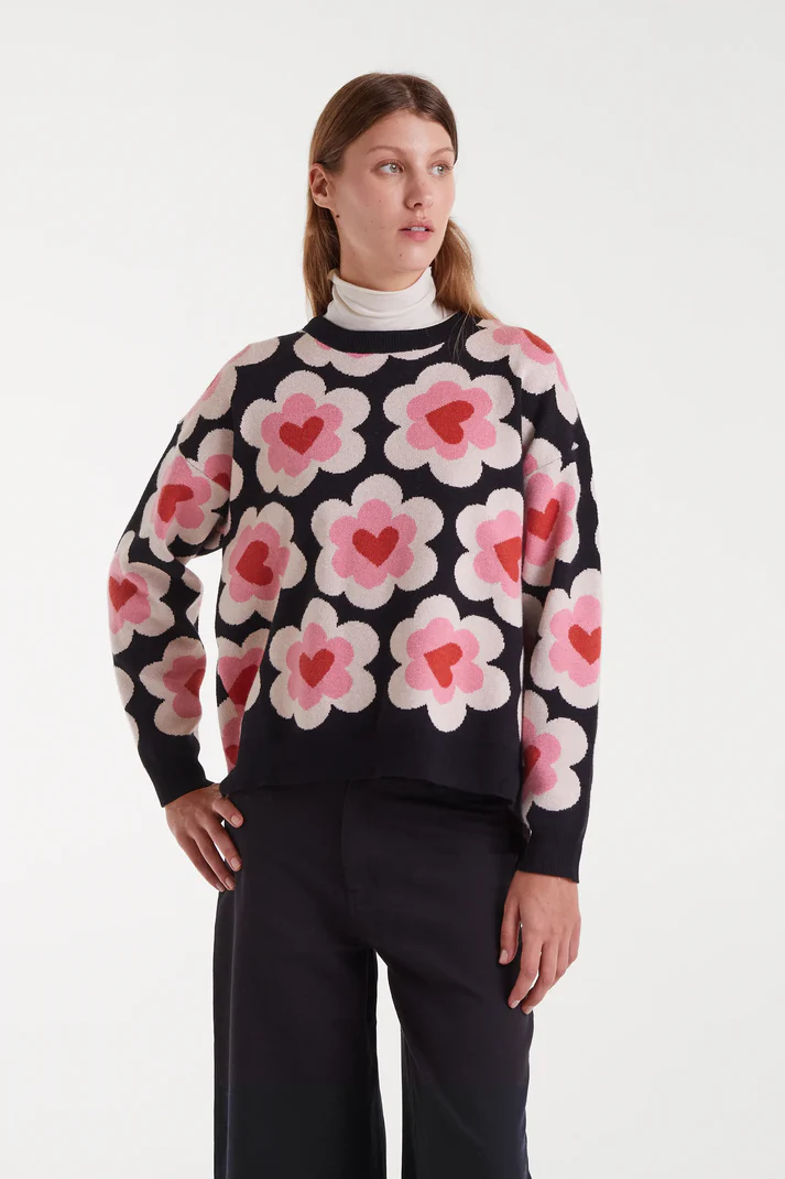 Jersey de la marca Compañía Fantástica, de punto jacquard con estampado SweetHeart. Cuello redondo y manga larga con hombro ligeramente caído. Detalles de puño con acabados en rib.
