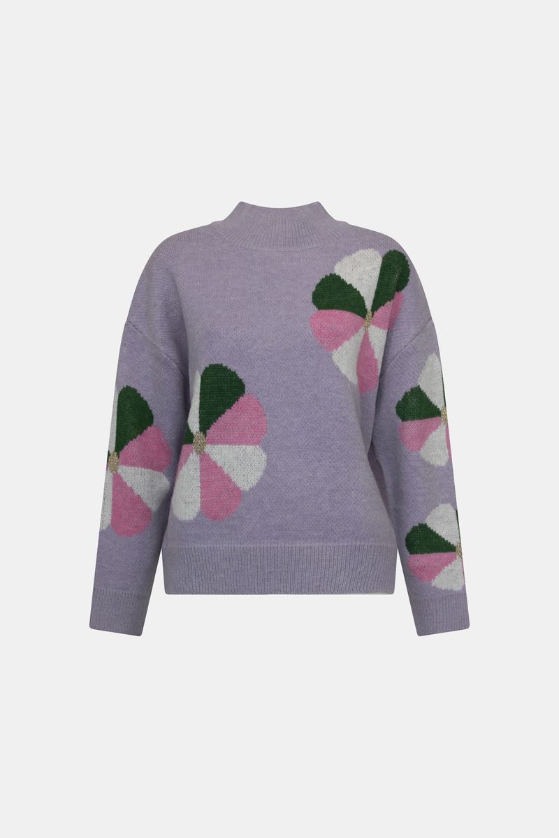 Jersey de punto de la marca MdM, cuello redondo, estampado flor geométrica en color lila.