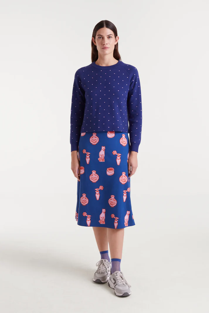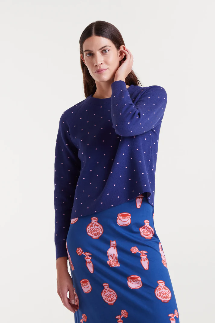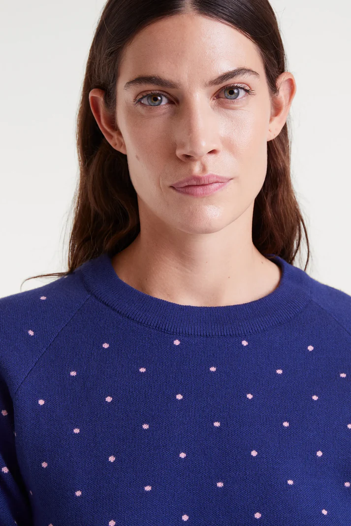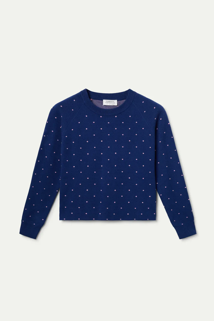 Jersey de la marca Compañía Fantástica, punto jacquard estampado topos mini de color azul marino y rosa. Cuello redondo y manga larga con detalles en rib.