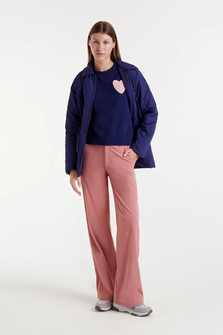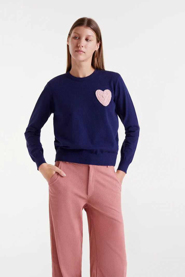 Jersey de la marca Compañía Fantástica, de punto de color azul marino con print bordado de corazón rosa, cuello redondo y manga larga. Detalles con acabados en rib.