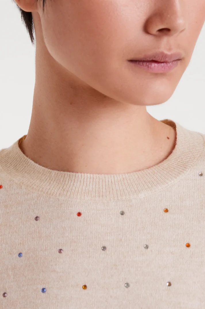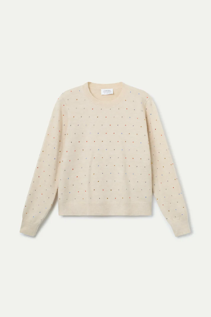 Jersey de la marca Compañía Fantástica, con tejido punto fino de color beige. Cuello redondo y manga larga. Detalles con aplicaciones brillantes multicolor. Acabados en rib. La modelo mide 177 cm y lleva la talla S.