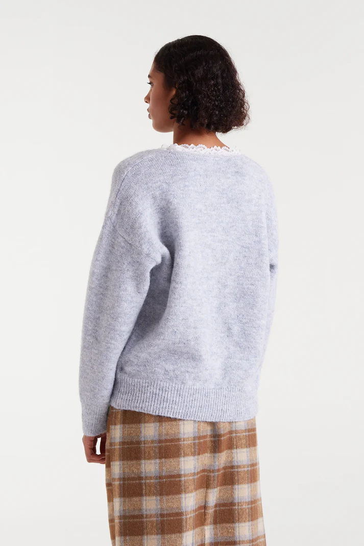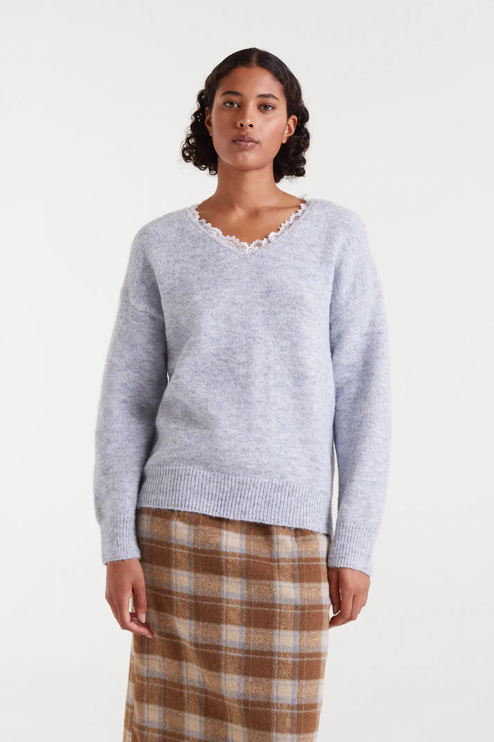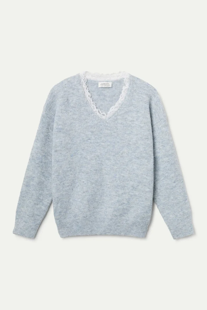 Jersey con tejido punto fino de la marca Compañía Fantástica, de color gris. Cuello pico con detalles de encaje en color blanco. Hombro ligeramente caído. Detalles en rib. La modelo mide 175 cm y lleva la talla S.