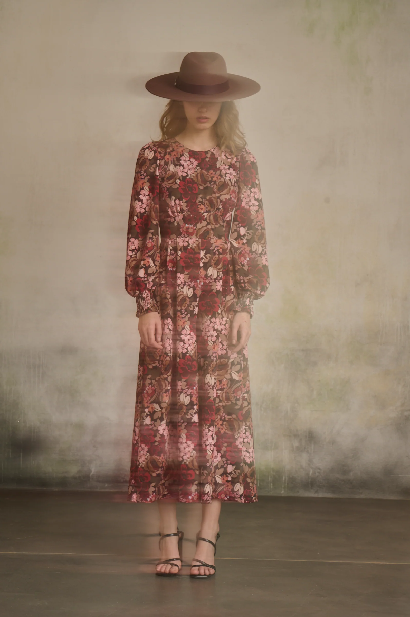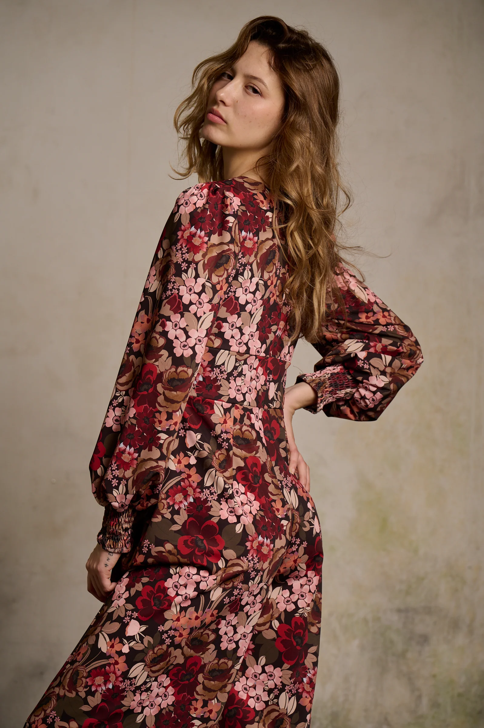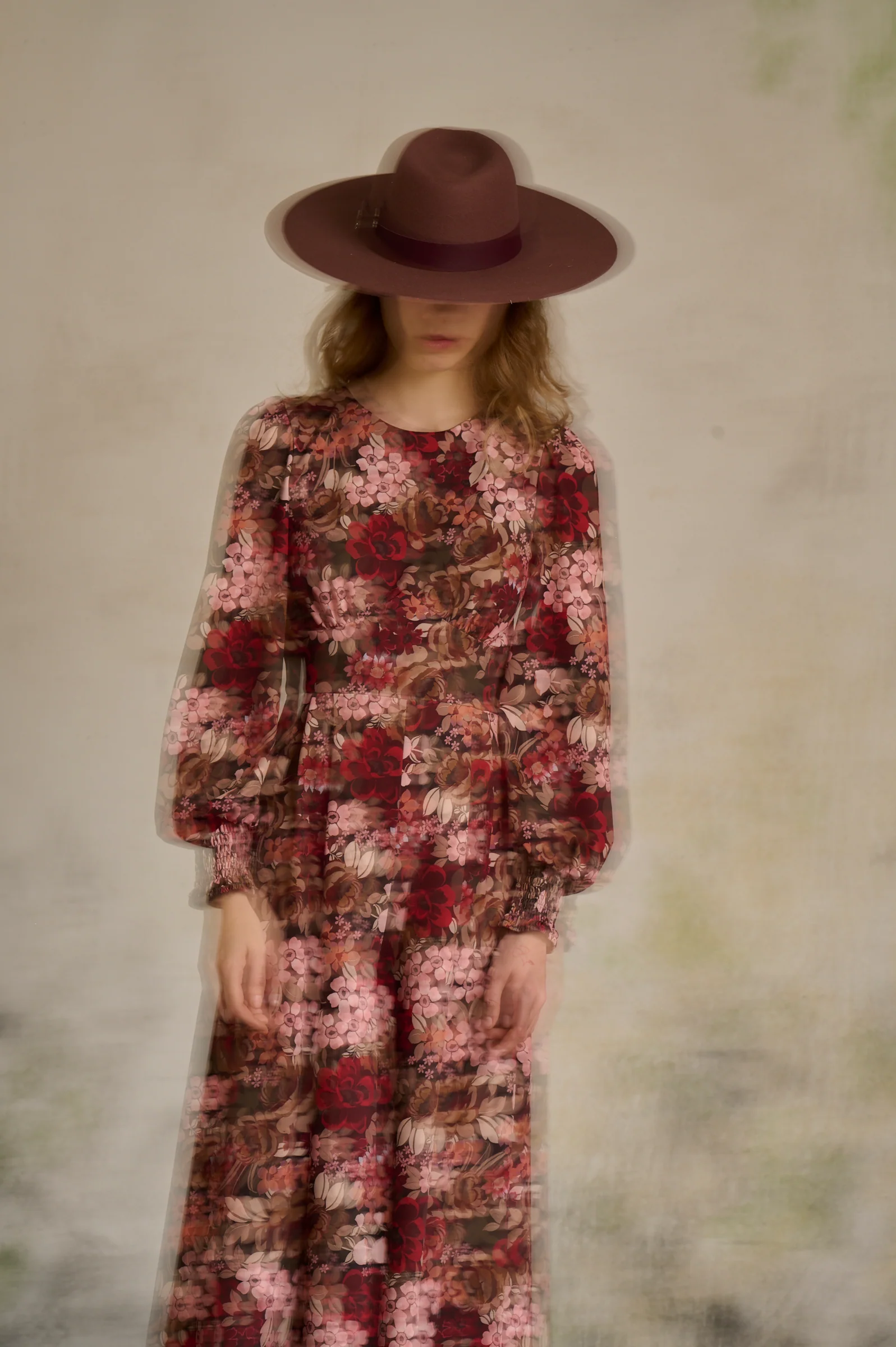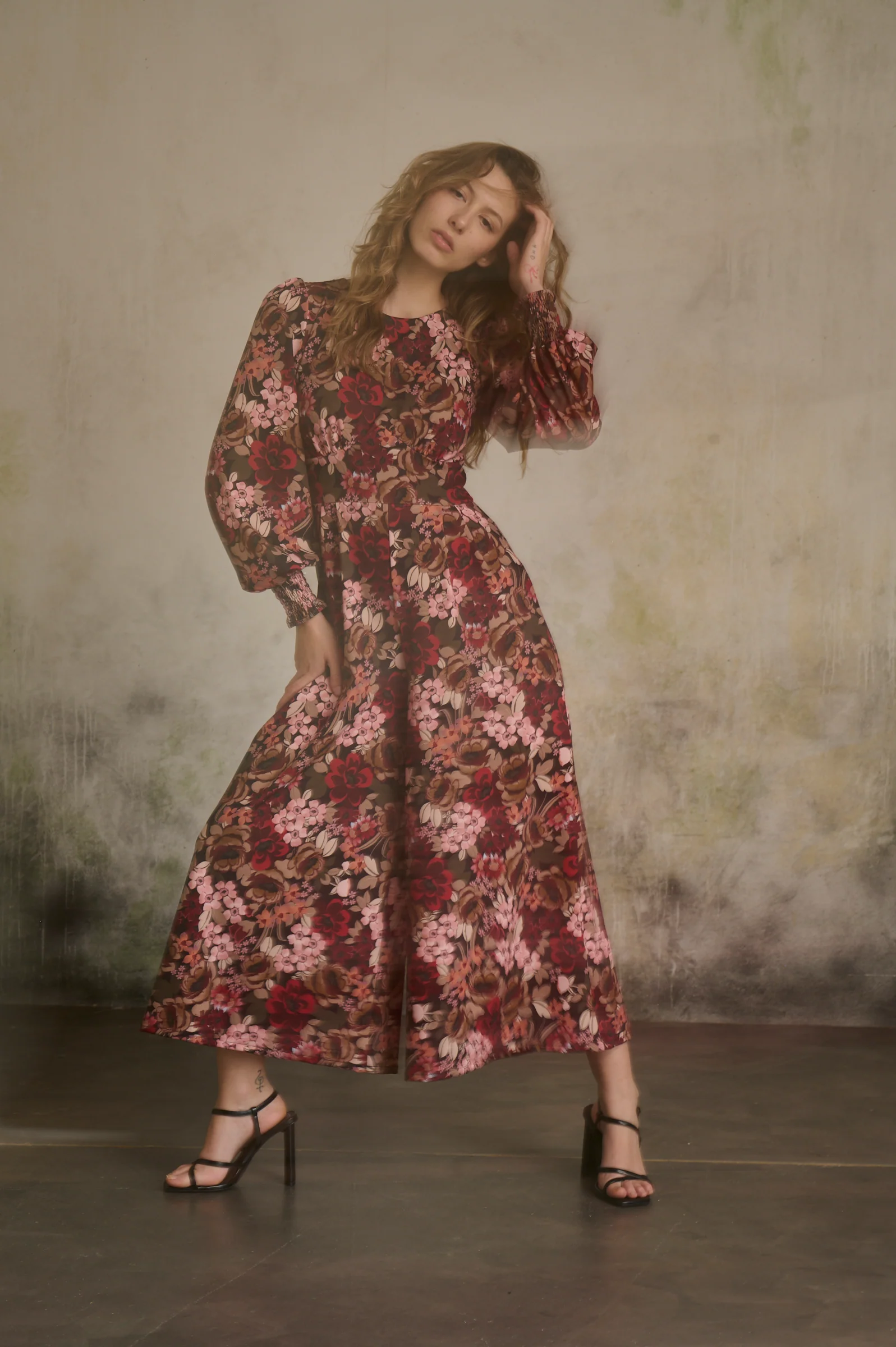 Mono de la marca Maggie Sweet, confeccionado en un tejido fluido, pantalón ancho con pliegues delanteros, cuello a caja, un fajín que ajusta bajo pecho y cremallera invisible en la espalda.