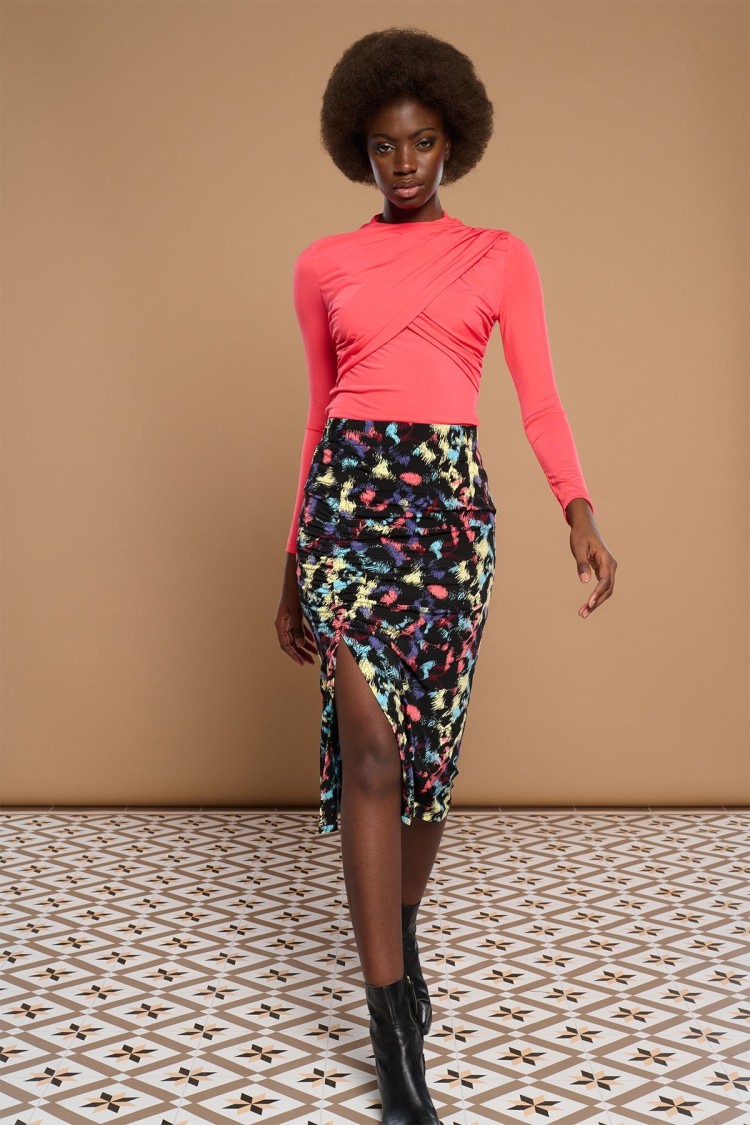 Camiseta de la marca Minueto, de cuello redondo y manga larga. Detalle de escote cruzado. Tejido elástico. Cierre en espalda con abertura y botón.