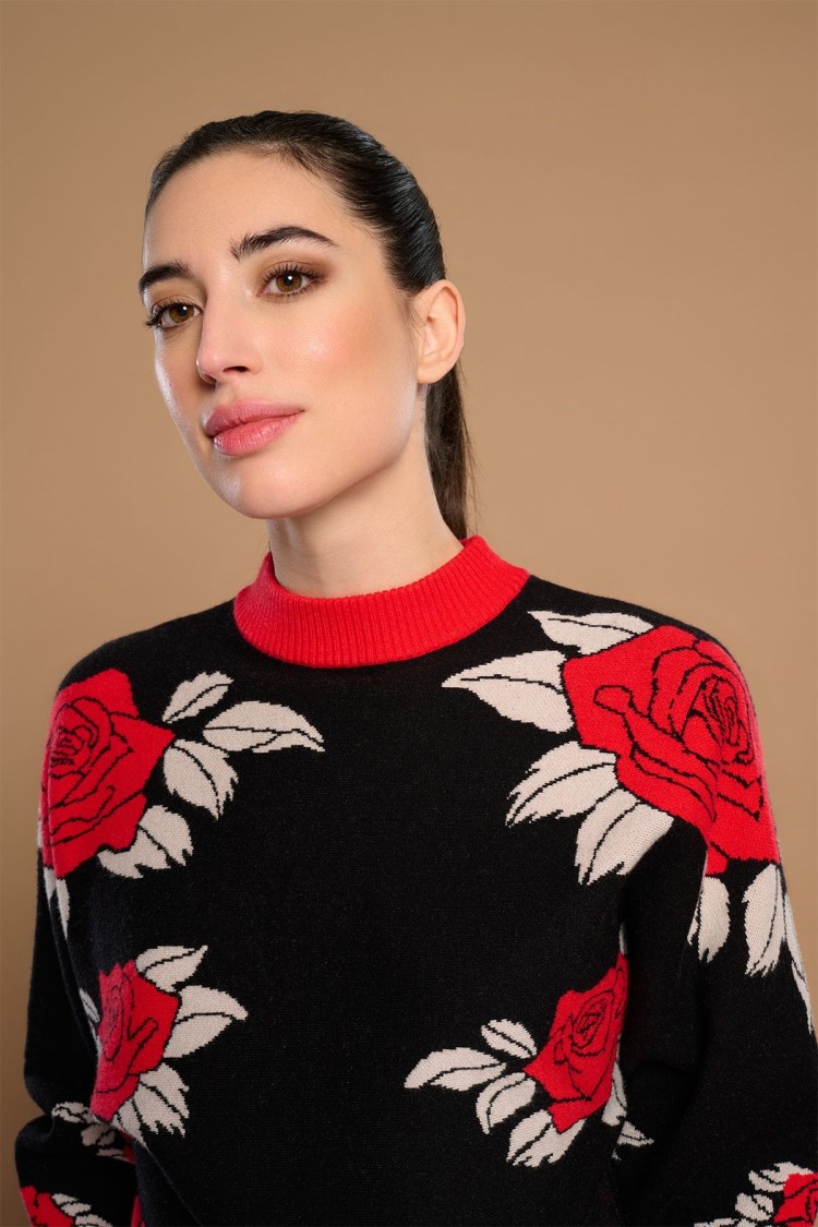 Jersey de punto de la marca Minueto con cuello redondo y manga larga. Cuello, cintura y mangas en rib. Color negro con estampado de flores en tonos rojos.