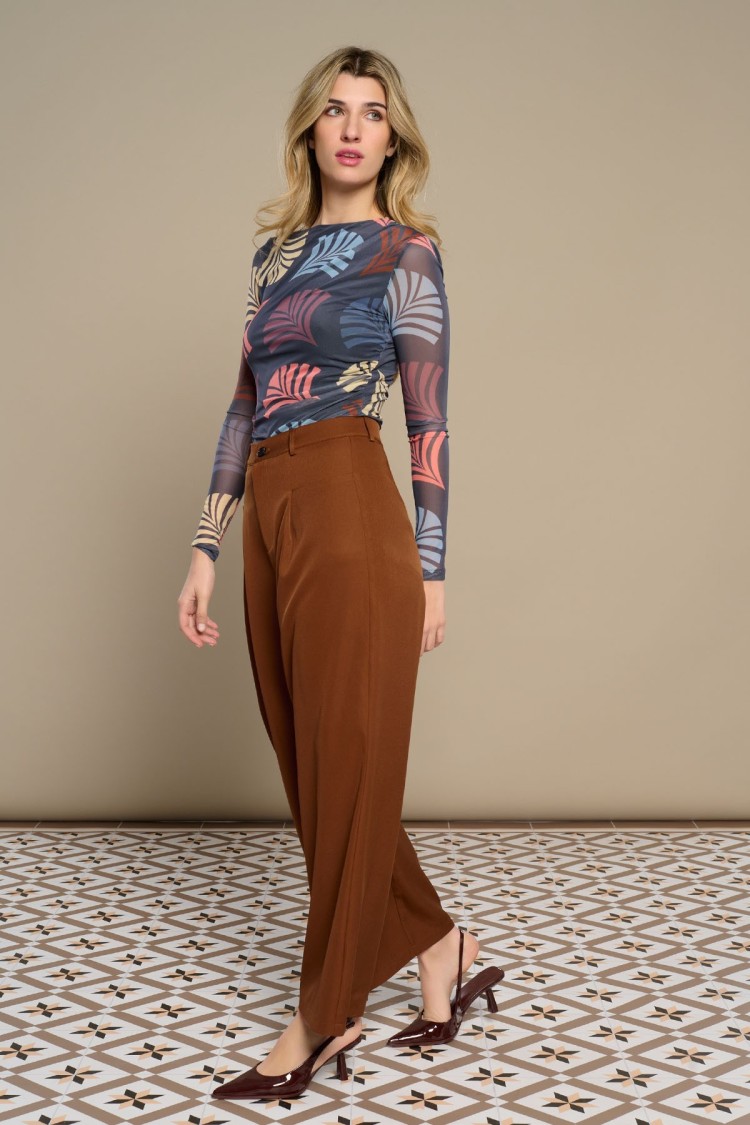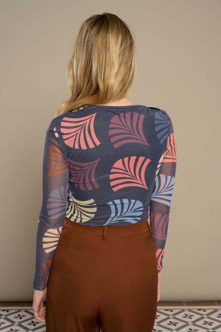 Camiseta de la marca Minueto, con tul y escote barco, de manga larga. Estampado molinillos en gris, amarillo, azul y granate. Tejido elástico. Forro interior elástico.