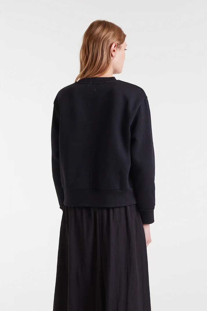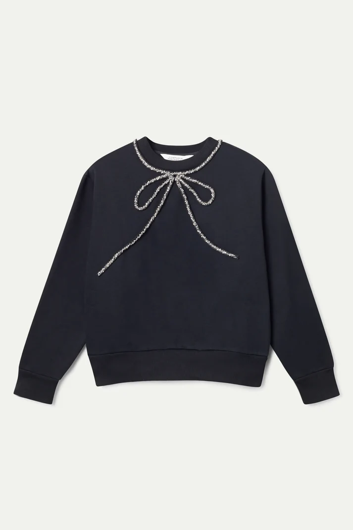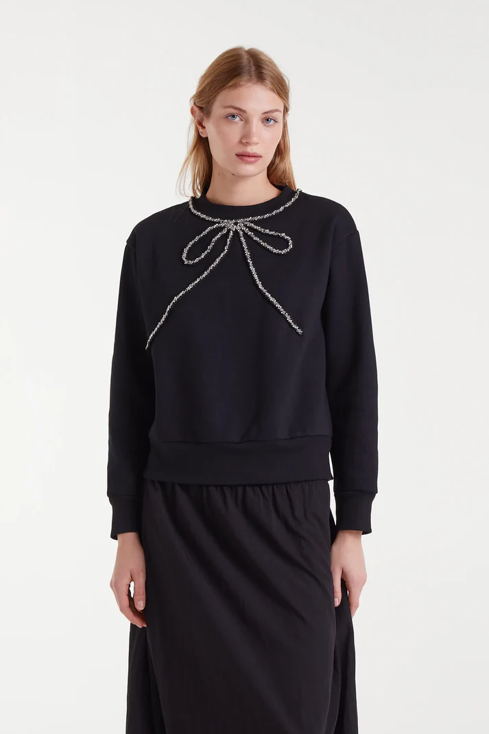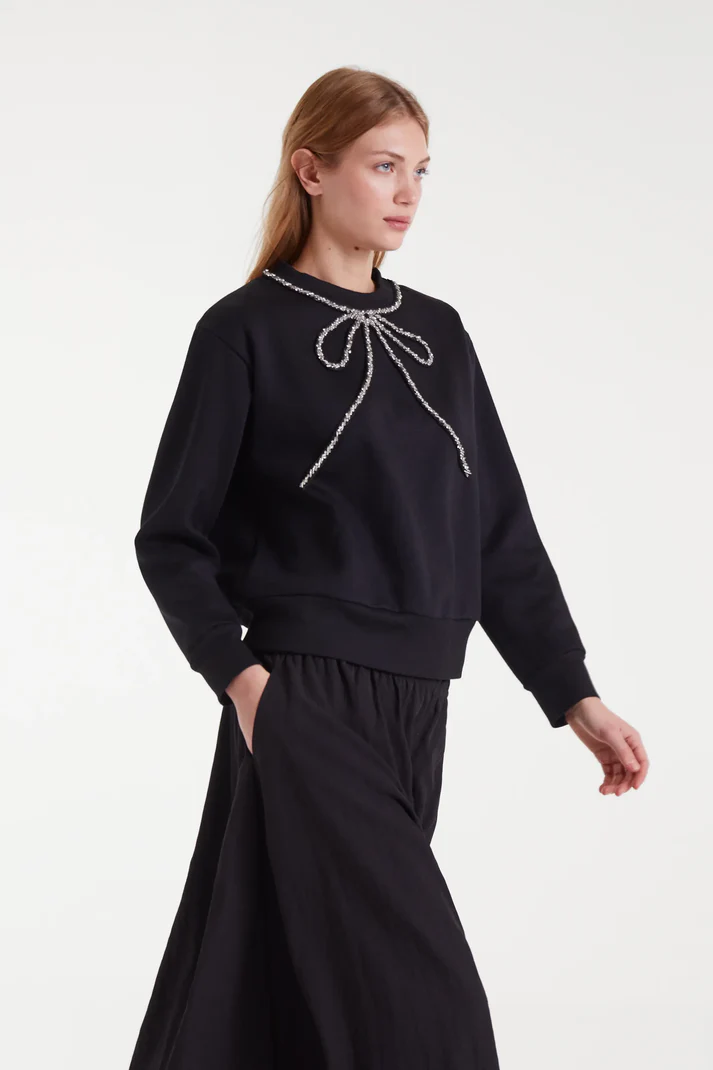 Sudadera de la marca Compañía Fantástica efecto algodón, con tejido forro polar interior, de color negro. Cuello redondo y manga larga. Detalle de lazo con pedrería en el cuello. Acabados en rib. La modelo mide 179 cm y lleva la talla S.