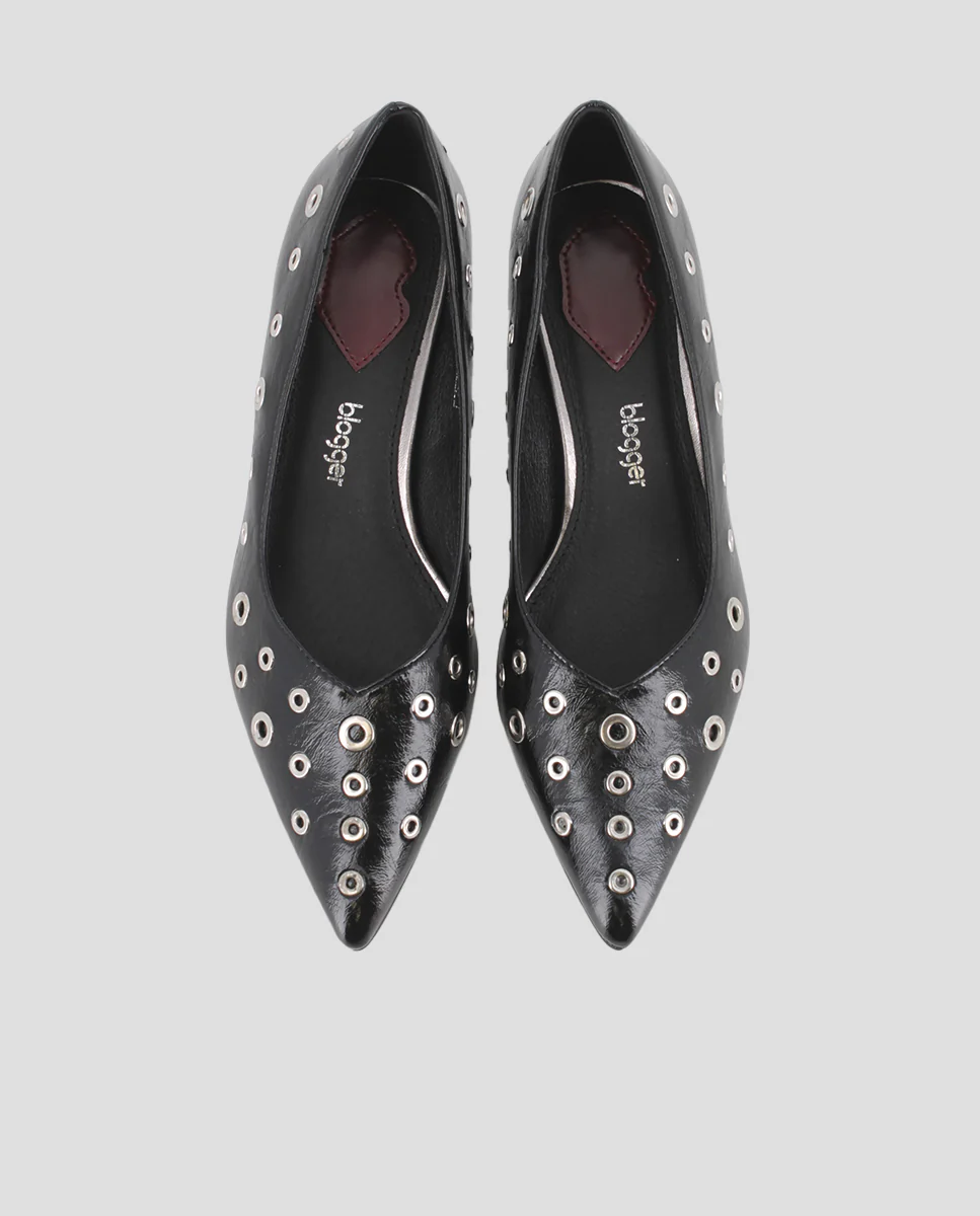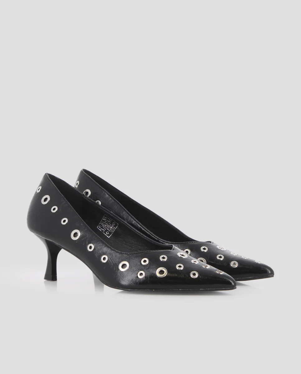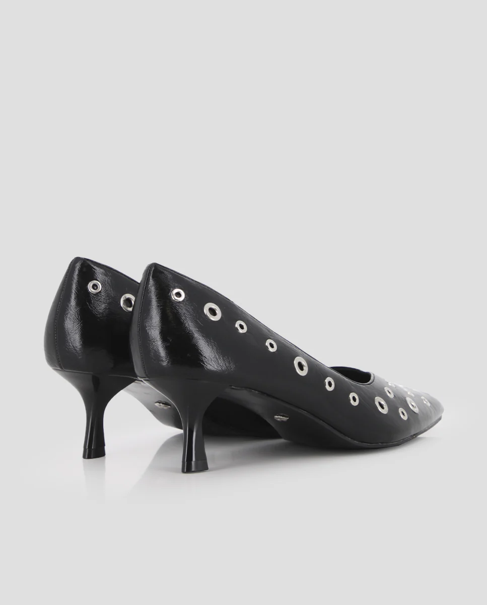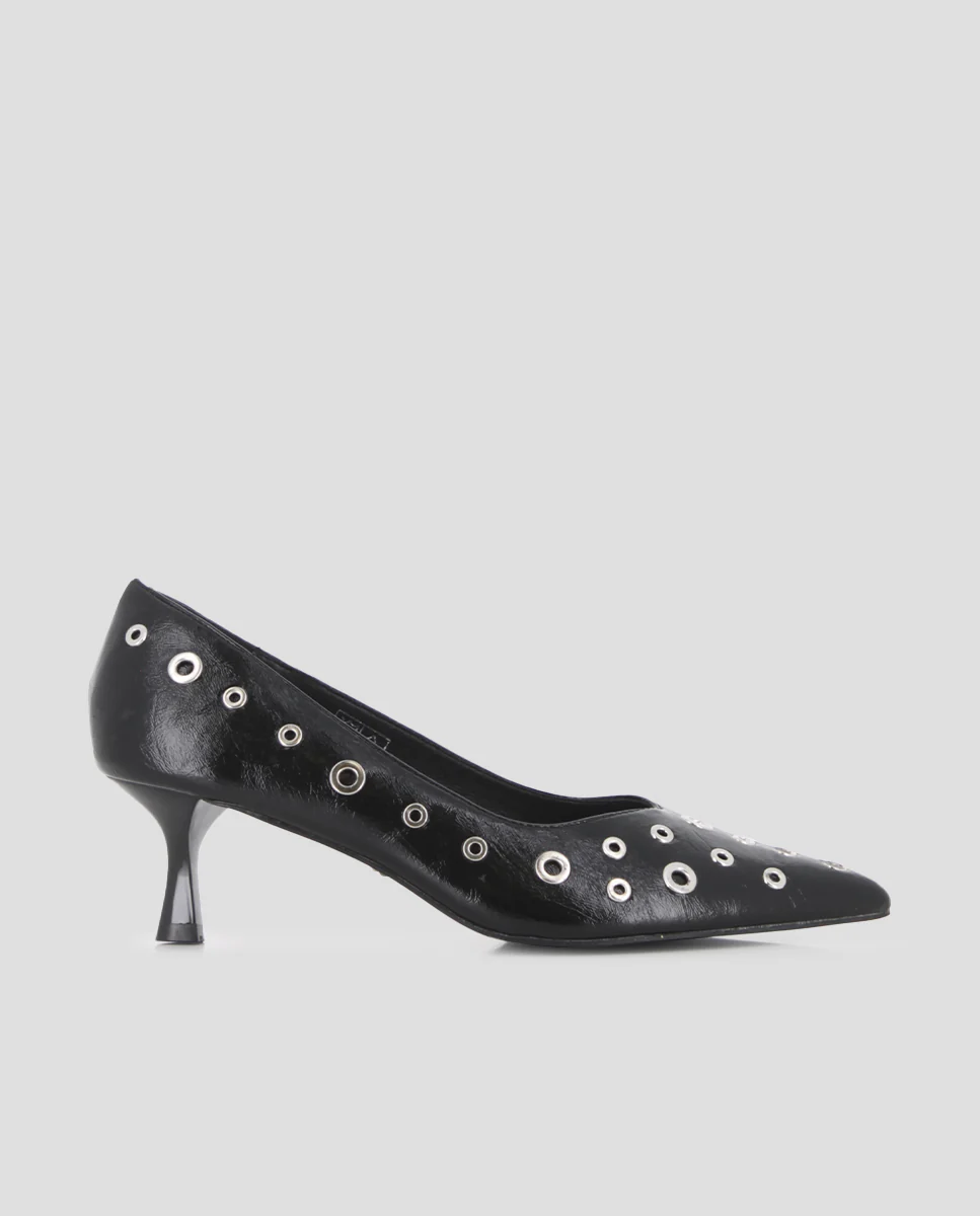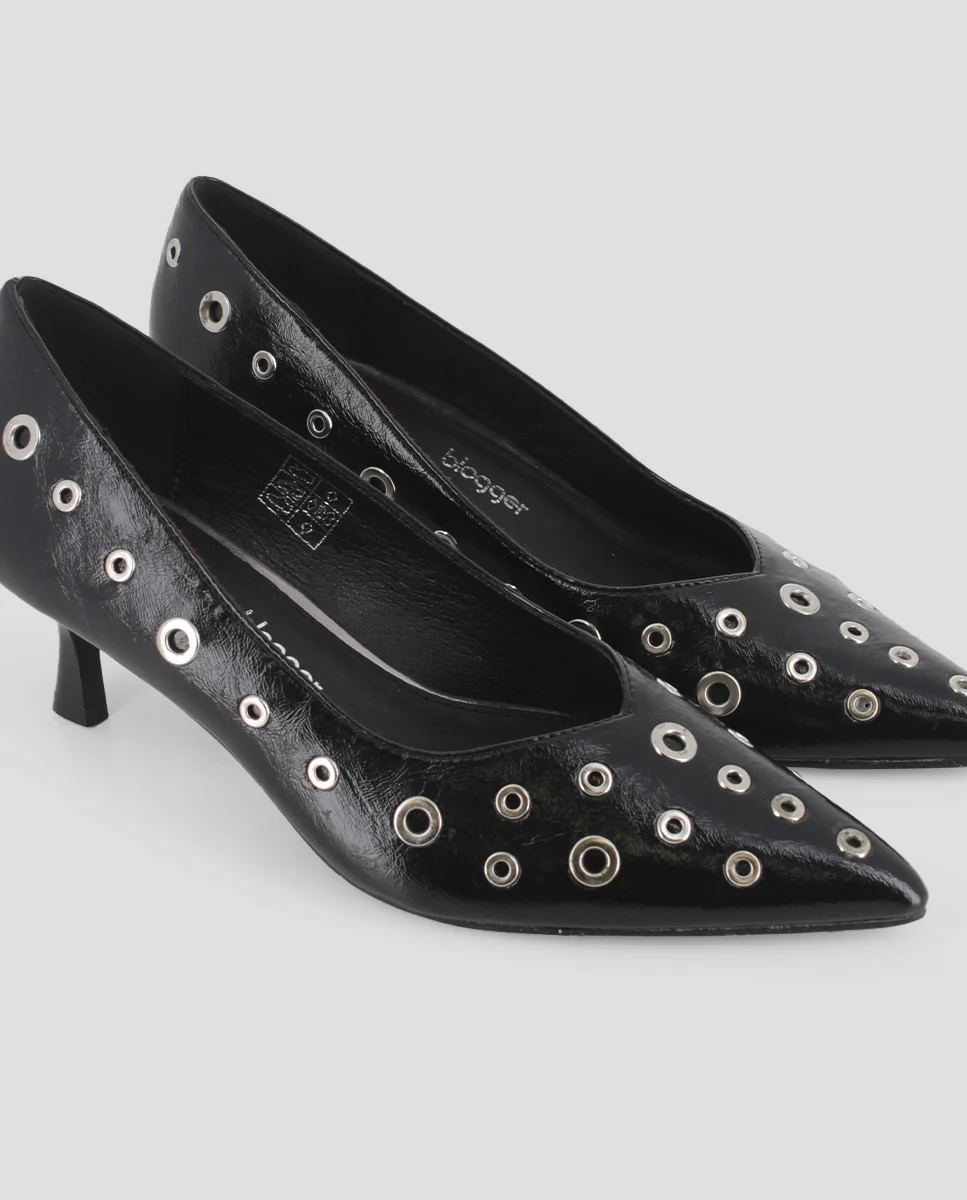 Zapatos de tacón estilo salón de la marca Blogger, en piel sintética color negro, decorados con ojales plateados en la parte superior que aportan un toque moderno y elegante. Tacón fino de 3 cm de alto y 1 cm de ancho para una pisada cómoda y estilizada. Forro interior y plantilla en piel para mayor confort y durabilidad.