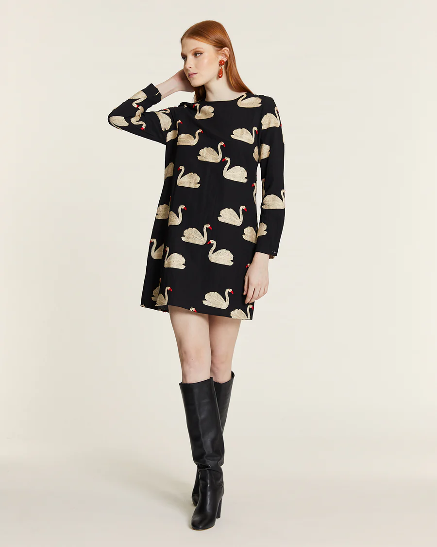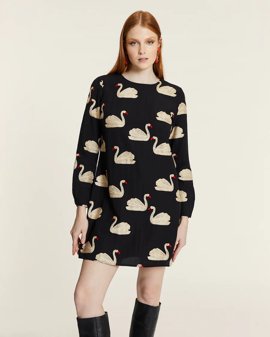Vestido de la marca Pepaloves, corto bordado cisnes, mangas largas rectas con puño abotonado, por debajo de la cadera.
