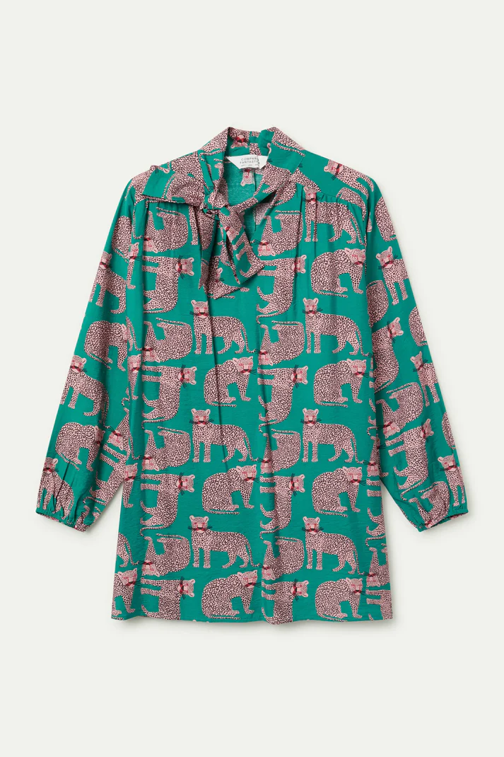 Vestido corto de la marca Compañía Fantástica, de tejido crepé ligero con estampado Onca. Con cuello alto lazado y manga larga terminada en puño con elástico.La modelo mide 175 cm y lleva la talla S
