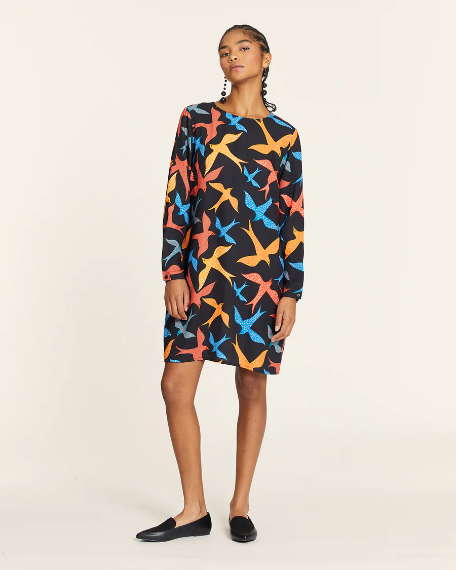 Vestido corto de la marca PepaLoves, estampado de pájaros, escote barco, de manga larga.