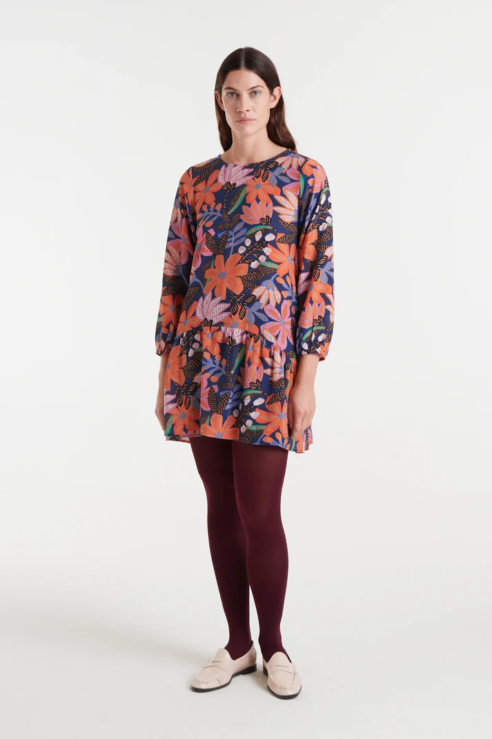 Vestido corto de la marca Compañía Fantástica, de tejido crepé ligero con estampado Tigerlily. Cuello barco y manga larga francesa con puño elástico. Bolsillos laterales.
