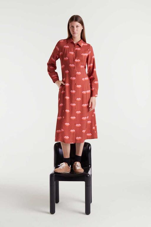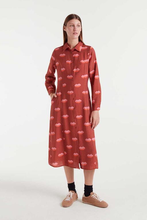Vestido midi camisero de la marca Compañía Fantástica con estampado Lips. Con cuello solapa y manga larga terminada en puño con botón. Cierre frontal con botones. Bolsillos laterales y cintura ajustable con cordón. La modelo mide 177 cm y lleva la talla S.