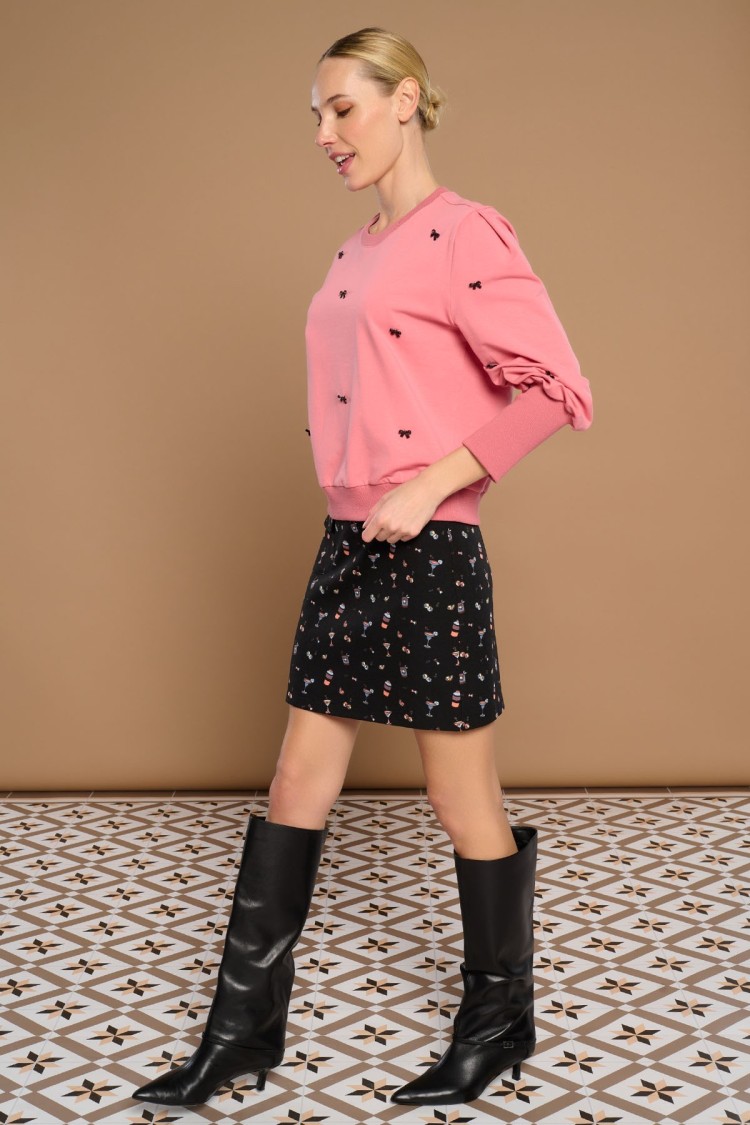 Falda de la marca Minueto, de tiro medio con estampado coctel, lleva forro interior.